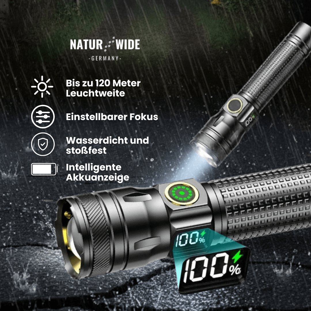 Aluminium LED Taschenlampe – Wiederaufladbar, Wasserdicht & Power-Display