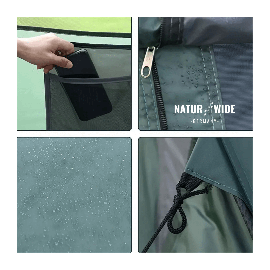 Mit seinem geräumigen Innenraum und der stabilen "Bootsform" bietet es ausreichend Platz für Paare, Familien oder Freundesgruppen (bis zu 8 Personen in der großen Variante). Das hochwertige 210D Oxford-Gewebe hält Feuchtigkeit zuverlässig ab, während die integrierten Moskitonetze für eine hervorragende Luftzirkulation sorgen und Insekten fernhalten.