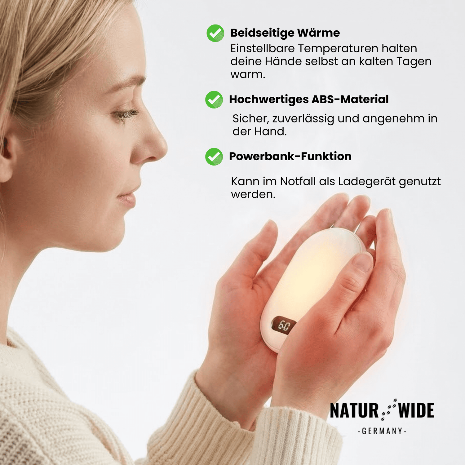 Eiskalte Finger beim Warten auf den Zug, beim Winterspaziergang oder auf dem Weihnachtsmarkt gehören mit diesem wiederaufladbaren Handwärmer der Vergangenheit an. Der kompakte Taschenwärmer heizt beidseitig, sodass deine Hände gleichmäßig und angenehm warm werden – ohne lange Wartezeit.