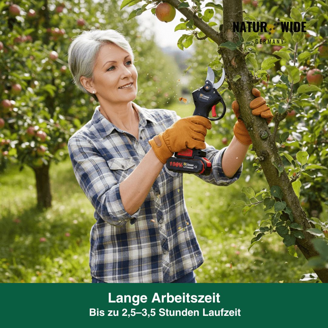 Im Lieferumfang sind direkt zwei Akkus enthalten, damit Sie Ihre Arbeit nicht unterbrechen müssen. Egal ob Rosensträucher, Obstbäume oder dicke Zweige: Steigern Sie Ihre Effizienz und genießen Sie die Gartenarbeit wieder ohne körperliche Anstrengung. Alles kommt sicher verpackt in einer robusten Kunststoffbox.