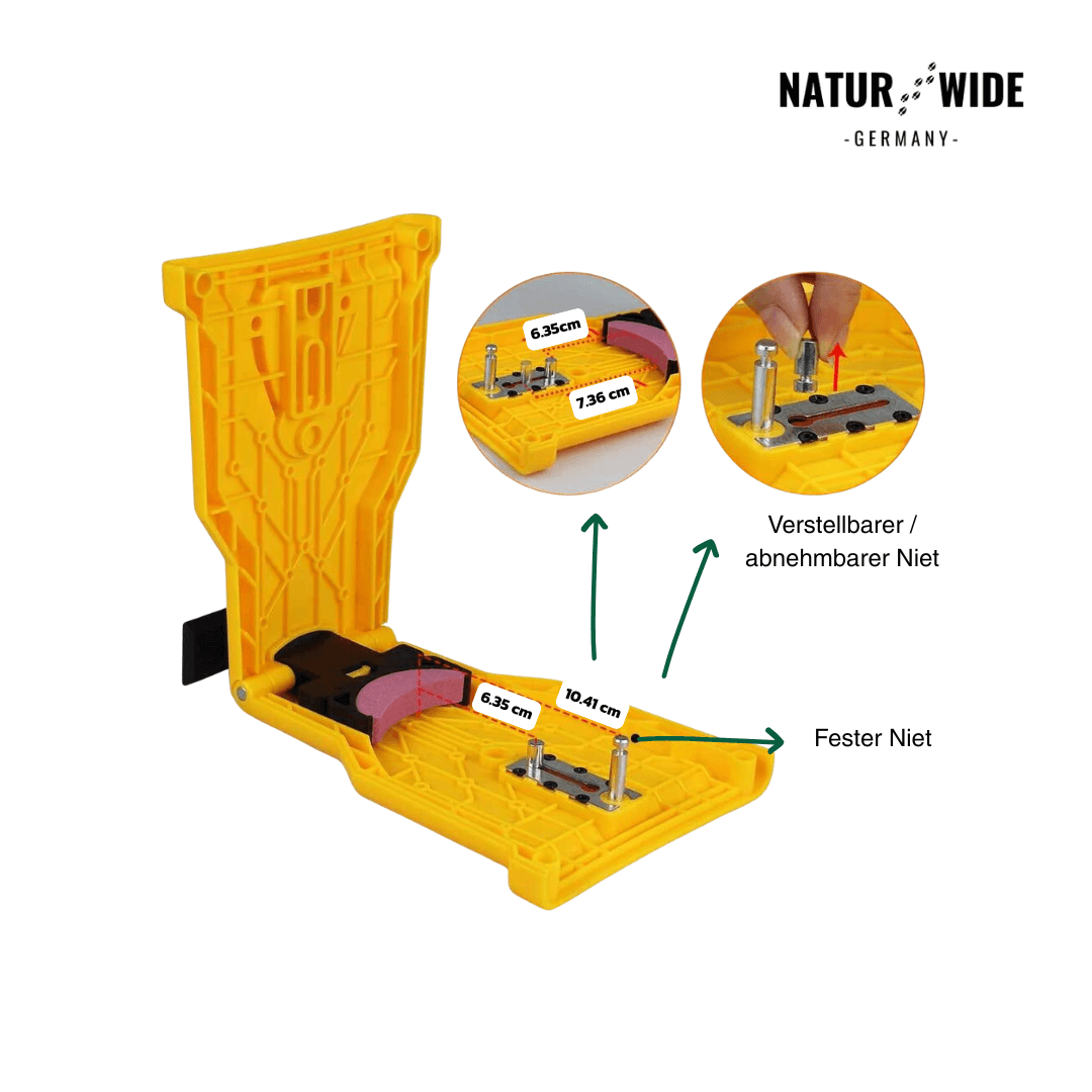 Das System ist extrem vielseitig: Es passt auf Führungsschienen von 14 bis 20 Zoll (ca. 35 bis 50 cm). Dank der intelligenten Konstruktion mit zwei Nieten (einer fest, einer verstellbar) ist es kompatibel mit Schwertern, die zwei Löcher haben. Hat Ihr Schwert nur ein Loch? Kein Problem! Der zweite Niet lässt sich einfach entfernen, sodass das Gerät universell passt.