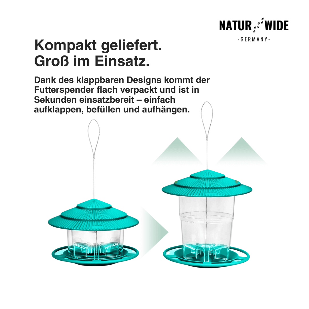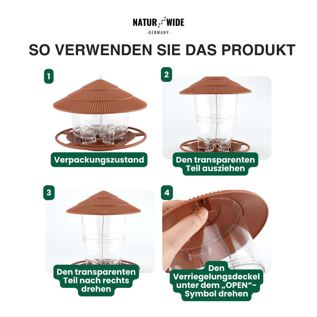 Die Installation und Reinigung sind denkbar einfach. Das Futterhaus kommt fertig montiert mit einem robusten Drahtseil zum Aufhängen an Ästen oder Haken. Der Deckel ist mit einem sicheren Twist-Lock-Verschluss (Drehverriegelung) ausgestattet – einfach drehen, Deckel abheben, Futter einfüllen und wieder verschließen. So bleibt das Futter sicher und trocken.