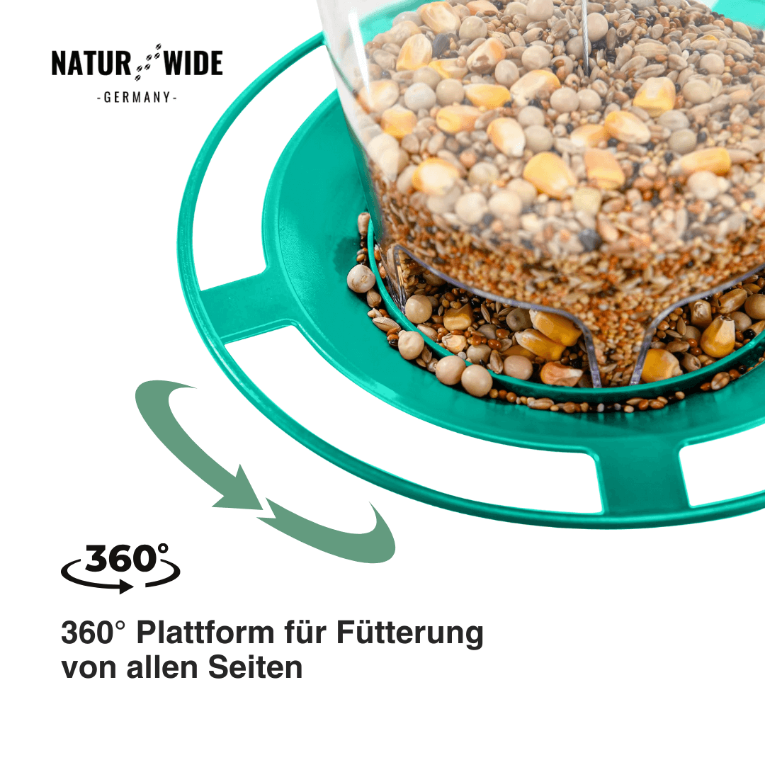 Die Futterstation ist nicht nur funktional, sondern auch benutzerfreundlich. Das transparente Gehäuse lässt Sie auf einen Blick erkennen, wann es Zeit für Nachschub ist. Mit einer Kapazität von ca. 1,2 kg (2,6 lbs) müssen Sie nicht täglich nachfüllen. Sie können verschiedene Samenmischungen, Sonnenblumenkerne oder Erdnüsse verwenden, um diverse Vogelarten wie Kardinäle, Meisen, Tauben oder Finken anzulocken.